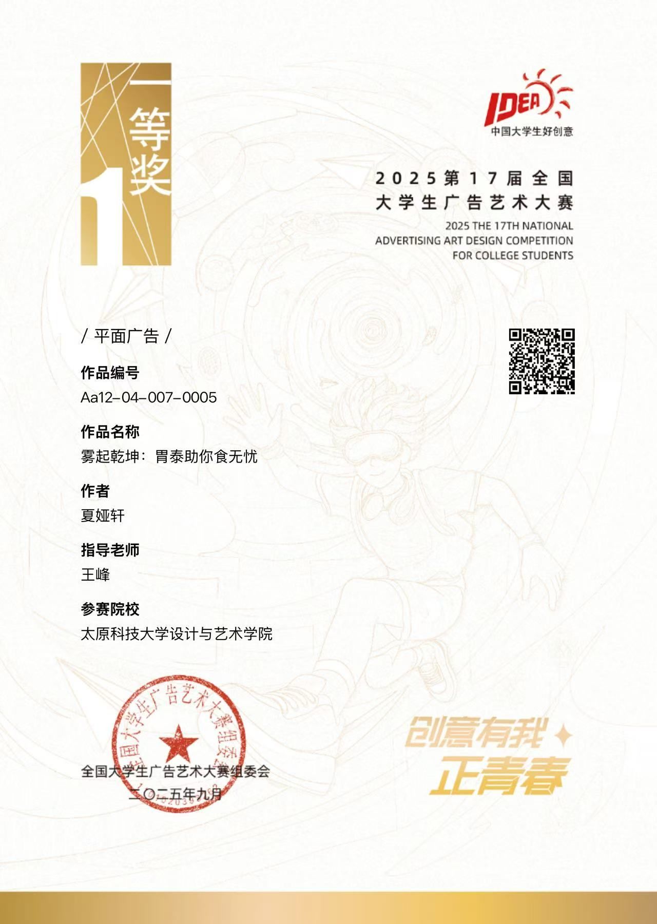 近日,我院夏娅轩同学创作、王峰老师指导的平面广告作品在2025年第17届全国大学生广告艺术大赛(简称“大广赛”)中,凭借出色的创意才华与扎实的专业能力,斩获国赛一等奖。其作品《雾起乾坤:胃泰祝你食无忧》以其深邃的文化内涵和精妙的视觉表达,在激烈竞争中脱颖而出,赢得评委的高度认可,实现了我校大广赛国赛一等奖“零的突破”。