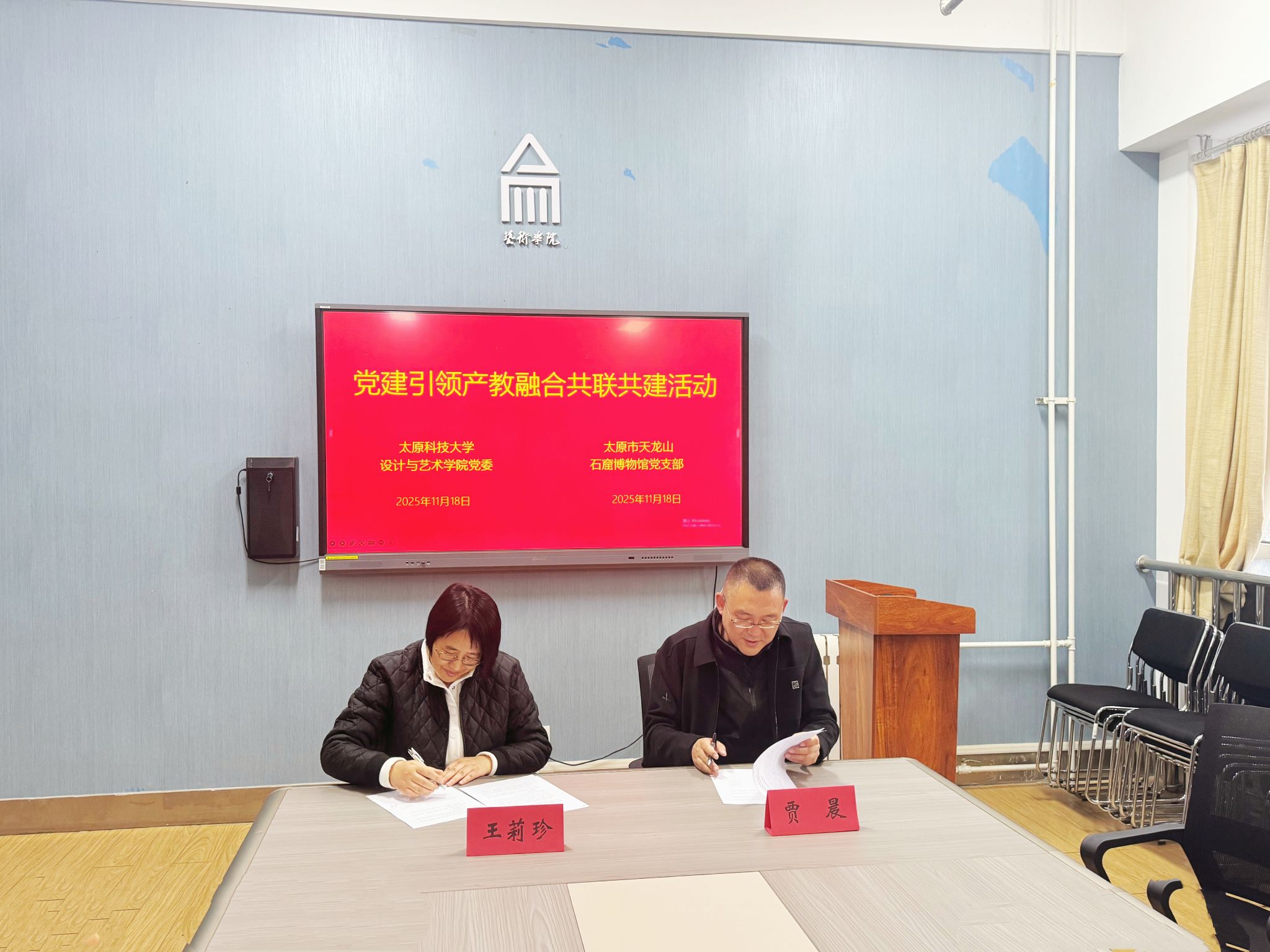 11月18日,我院与太原市天龙山石窟博物馆党建联建共建活动在学院会议室举行。天龙山石窟博物馆副院长贾晨及相关部门负责人和学院党委理论学习中心组成员共同参加活动。仪式由院党委书记王莉珍主持。