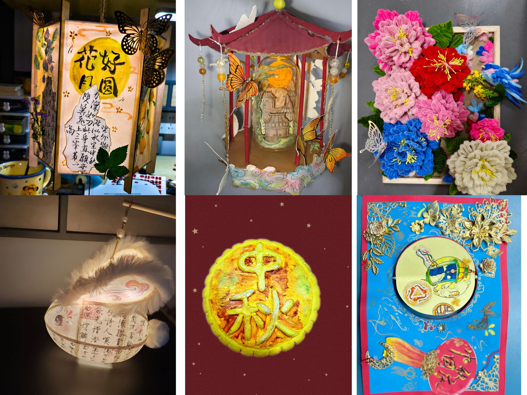 本次大赛参赛作品形式多样,有绘画、书法等作品共70余件,有手工剪纸、花灯、粘土、绒花等特色手工作品共40余件。这些作品通过同学们精湛的技艺和独特的艺术表现手法,将中秋团圆与国庆盛景通过多种形式进行生动呈现,既弘扬了中华优秀传统文化,传递了同学们浓厚的爱国情怀,又丰富了校园文化生活,营造了热烈喜庆的节日氛围。